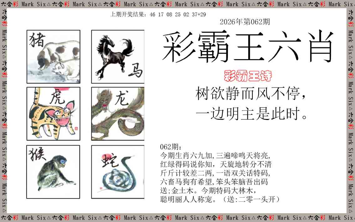| 062期【三连肖/11.12倍】 【虎蛇马】【牛鸡羊】【鼠兔龙】 【蛇马牛】【鸡羊鼠】【兔龙虎】 开:00-00-00-00-00-00 特00 |