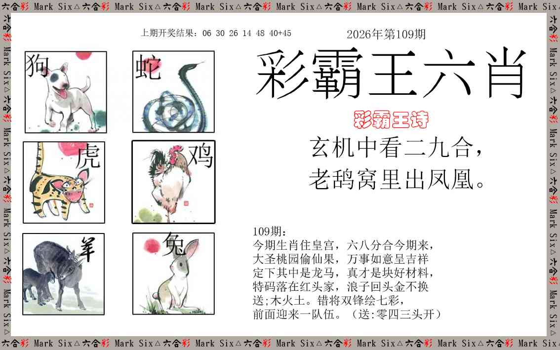 | 108期【三连肖/11.12倍】 【虎蛇马】【牛鸡羊】【鼠兔龙】 【蛇马牛】【鸡羊鼠】【兔龙虎】 开:00-00-00-00-00-00 特00 |