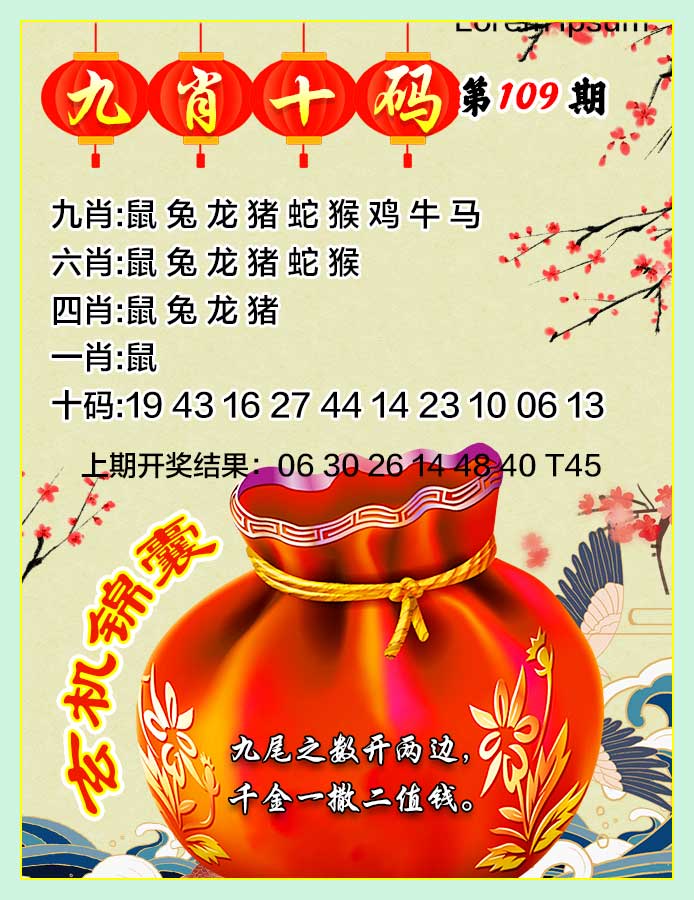 | 109期【三连肖/11.12倍】 【???】【???】【???】 【???】【???】【???】 开:00-00-00-00-00-00 特00 |