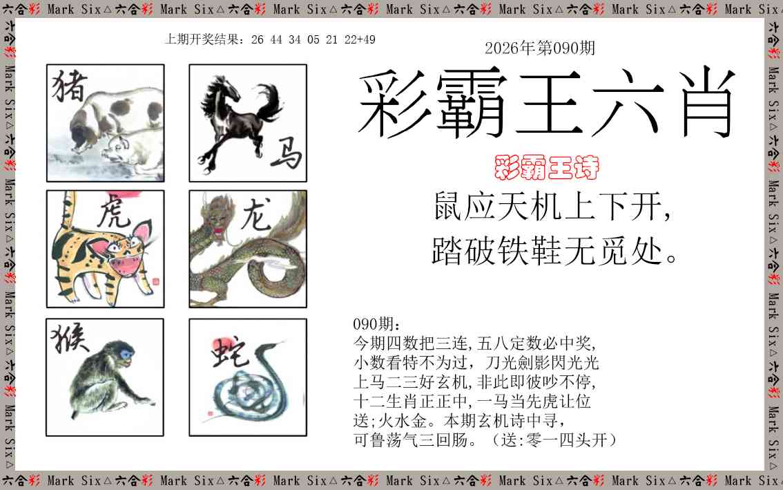 | 090期【三连肖/11.12倍】 【虎蛇马】【牛鸡羊】【鼠兔龙】 【蛇马牛】【鸡羊鼠】【兔龙虎】 开:00-00-00-00-00-00 特00 |