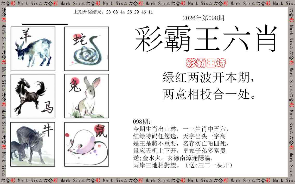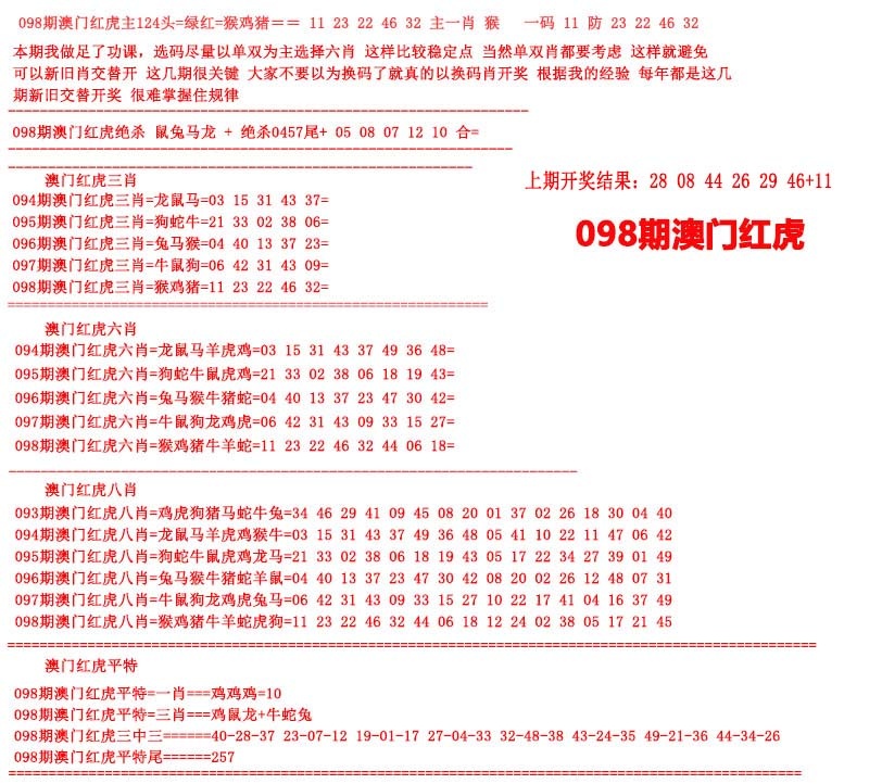 | 098期【三连肖/11.12倍】 【虎蛇马】【牛鸡羊】【鼠兔龙】 【蛇马牛】【鸡羊鼠】【兔龙虎】 开:00-00-00-00-00-00 特00 |